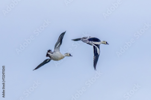 Obraz premium 飛翔する二羽の雄のミコアイサ