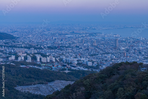 Obraz premium 日本 兵庫県神戸市の摩耶山の掬星台展望台から眺める神戸の夕方の街並み