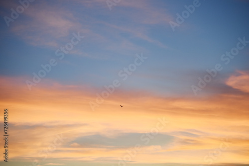 Obraz premium 夕焼けに飛ぶ一羽の鳥のシルエット 青 オレンジ グラデーション 空 風景 鳥