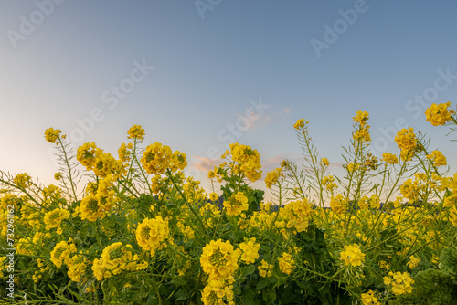 Naklejka premium 夕暮れ時の青空に映える菜の花畑に咲く菜の花