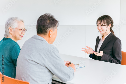 Obraz premium 高齢者夫婦の相談・カウンセリングに応じる女性ソーシャルワーカー・支援相談員・生活相談員・社会福祉士