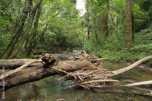 Fototapeta premium 倒木と緑の森の間を流れる川