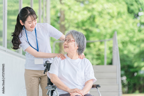 © buritora, Fototapeta premium 病院・介護施設で肩のリハビリする車椅子に乗る高齢者と介護士(理学療法士・看護師)