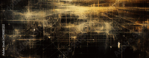 © Marios, Naklejka premium 黒と黄色は背景を重ねます。暗い金属パターンのテクスチャ。モダンなオーバーラップディメンションベクターデザイン。黄色の輝く線と未来的な穴あき技術の抽象的な背景
