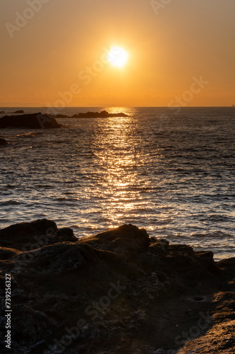 Obraz premium 朝日のオレンジ色に染まる城ヶ島の海