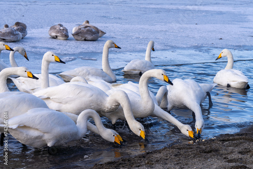 Obraz premium 北海道 弟子屈 屈斜路湖 白鳥 冬 ポップコーンを食べる白鳥
