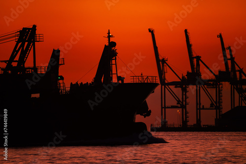 Obraz premium 関門海峡の朝焼けの中のガントリークレーンと貨物船のシルエット20240218-2