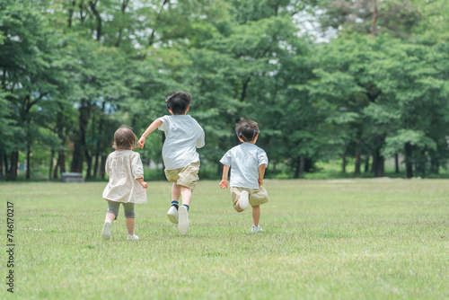 Fototapeta premium 公園で追いかけっこする活発な子供達・兄弟・走る・短距離走