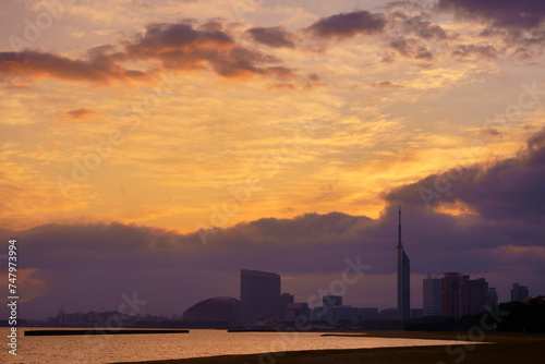 Obraz premium 福岡百道浜方面の朝焼けの中のシルエット
