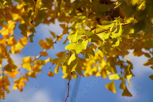 Fototapeta premium 緑が混じる黄色いイチョウの木