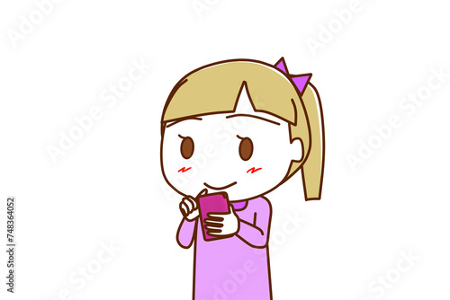 Fototapeta premium (上半身斜め)スマホを持って画面を見ながらにっこり微笑む白人少女