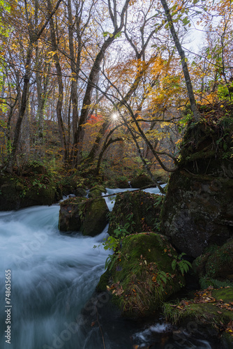 Obraz premium 日本 青森県十和田市、十和田湖の子ノ口から焼山まで続く奥入瀬渓流の飛金の流れと紅葉
