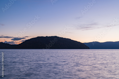 Fototapeta premium 日本 青森県十和田市、十和田湖の子ノ口港から見える夕暮れ時の湖