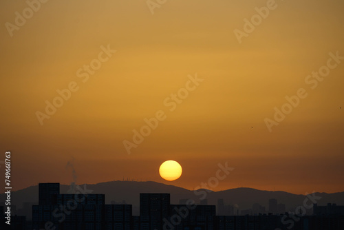 Obraz premium 生駒山系から朝日が登る時。神戸市内から芦屋のビルと山並みをシルエットで撮影。