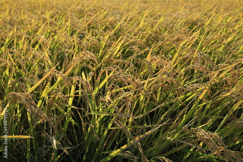 Fototapeta premium 田んぼで収穫を待つ稲穂の風景