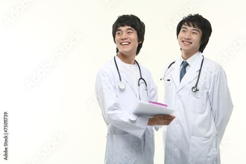 © jsco, Fototapeta premium 스튜디오 안의 의사가운을 입은 의사와 수술복을 입은 의사