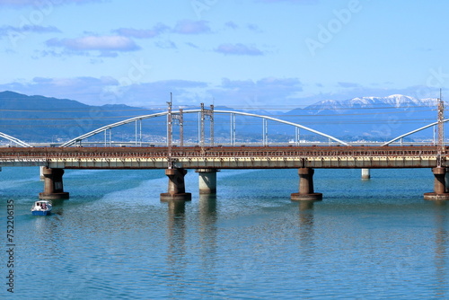 © So Takinoiri, Fototapeta premium 雪の積もった蓬莱山と瀬田川を渡る橋