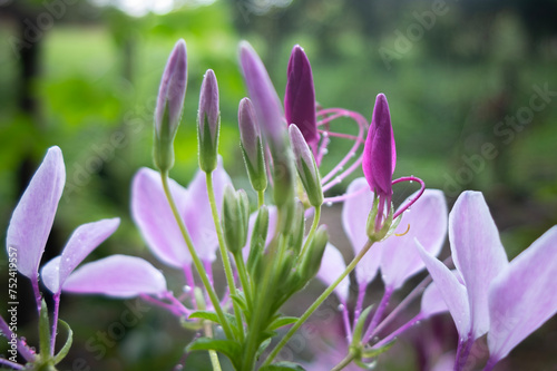 © MTBS PHOTO, Fototapeta premium 雨上がりに輝く紫色の美しいクレオメ