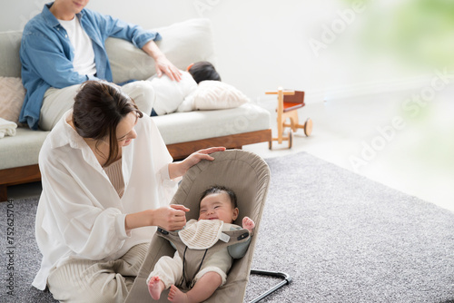 Obraz premium リビングで子育てをする4人アジア人(日本人)家族 見つめ合う赤ちゃんとお母さん