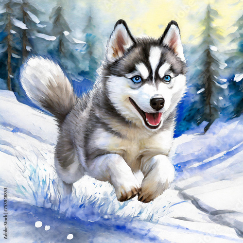 Naklejka premium 눈위에 달리는 허스키