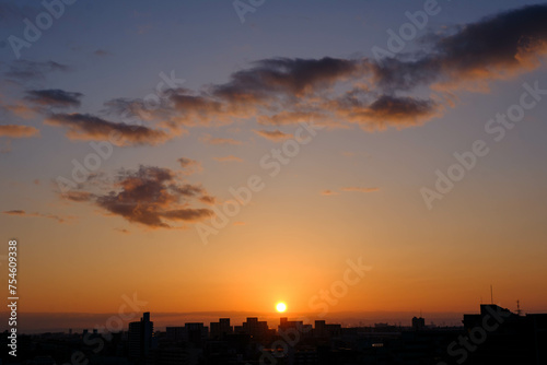 Fototapeta premium 都市の夜明け。神戸市から芦屋大阪方面をのぞむ。生駒の山並みから朝日が昇る。都市のビルがシルエットで浮かぶ。