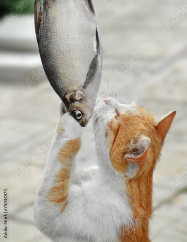 © vsegda22, Obraz premium Добыча, еда. Кошка, стоя на задних лапах, схватила крупную рыбу
