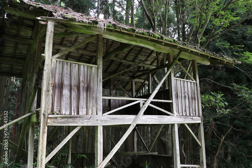 Obraz premium 山奥の高床式の壊れかけの小屋