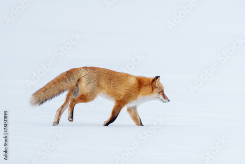 Obraz premium 雪原を歩くキタキツネ 冬の北海道観光 可愛い野生動物