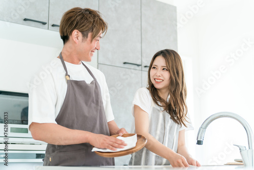 © buritora, Fototapeta premium マイホームのキッチンで一緒に家事・お皿洗いををしながら会話する仲良しのアジア人夫婦の男女