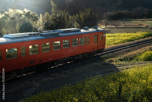 Naklejka premium 石神の菜の花畑と小湊鉄道・千葉県