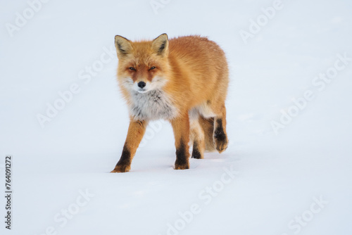 Fototapeta premium 冬の可愛いモフモフなキタキツネ 冬の北海道の野生動物