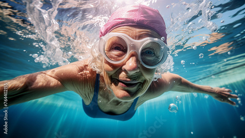 Naklejka premium 水泳・スイミングをする元気な高齢者の女性・プールで泳ぐシニア