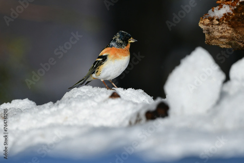 Naklejka premium 冬の森でのバードウォッチングで見らえる身近な美しい小鳥、アトリ