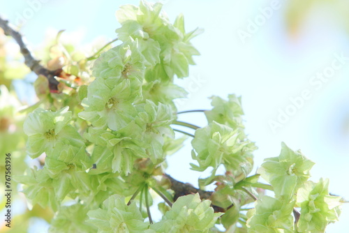© naname21, Fototapeta premium 満開の八重桜(御衣黄)のクローズアップ 空背景
