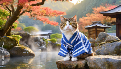 Obraz premium 紅葉シーズンの温泉と浴衣を着た看板猫
