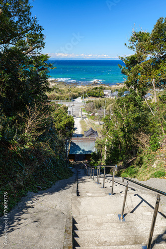 Naklejka premium 洲崎神社の本殿からの参道と太平洋の眺め