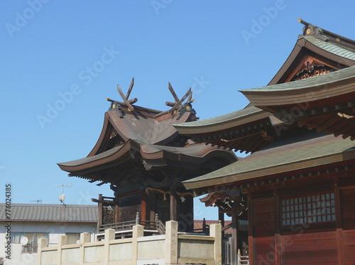© Toshiyuki, Fototapeta premium 日本の神社。 拝殿後ろの本殿。 屋根の飾りから男神の本殿。 倉敷市福田神社。