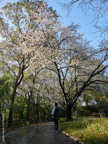 Fototapeta premium 春の公園で桜の花見する中年女性の姿