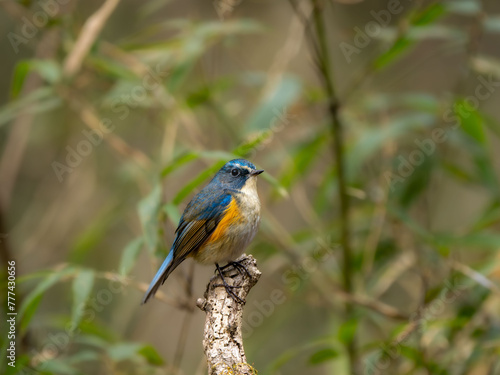 Naklejka premium 森の中で枯れ枝の先に留まっているルリビタキの雄