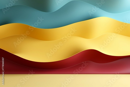 © Queso, Obraz premium 立体的な背景。青緑とワインレッドと黄色の曲線的な壁がある抽象的な空間