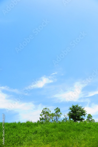 Obraz premium 白い雲と青い空と緑の木と草の丘の風景12