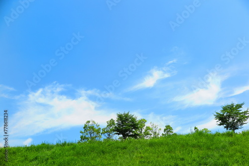 © ken1344, Fototapeta premium 白い雲と青い空と緑の木と草の丘の風景11