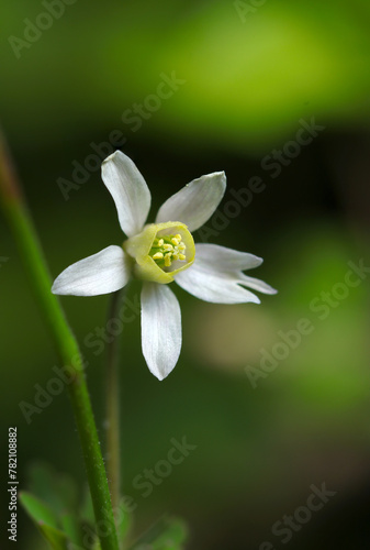 © SAIGLOBALNT, Fototapeta premium 小さく可憐な日本オダマキに似るヒメウズの花ポートレート(自然光+ストロボ、マクロ接写撮影)