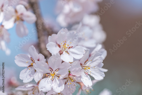 Fototapeta premium 青空マクロ撮影:青空の下満開に咲いた桜の花の下満開に咲いた桜の花