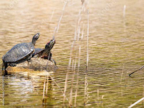 Fototapeta premium 日光浴するアカミミガメ・ミドリガメ・コピースペース