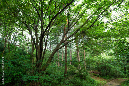 Obraz premium 푸르른숲에 오솔길이 있는 산책로