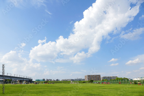 © oka, Obraz premium 青い空と緑 芝生のグランドイメージ
