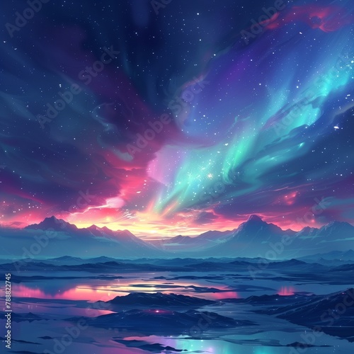 Fototapeta premium 静かな山の湖に広がるカラフルなオーロラの夢景色テクスチャ背景