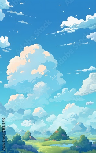 Fototapeta premium 青空と白い雲が広がる自然風景のファンタジーイラスト