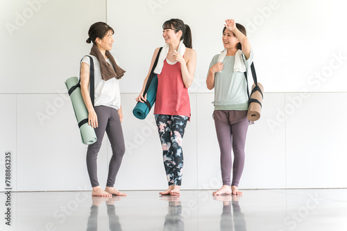 Fototapeta premium ヨガ教室に通う女友達・ママ友・インストラクター(ダイエット・ワーク運動・トレーニング・フィットネス)